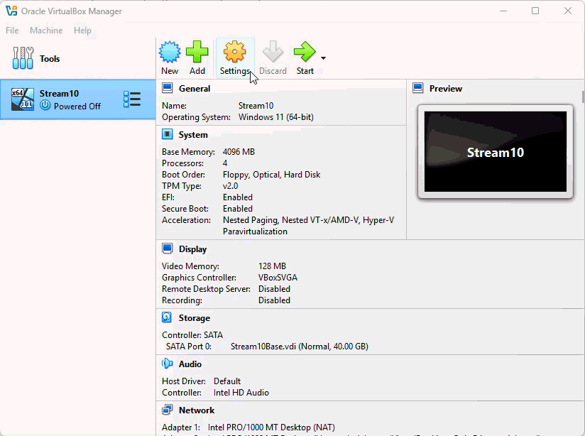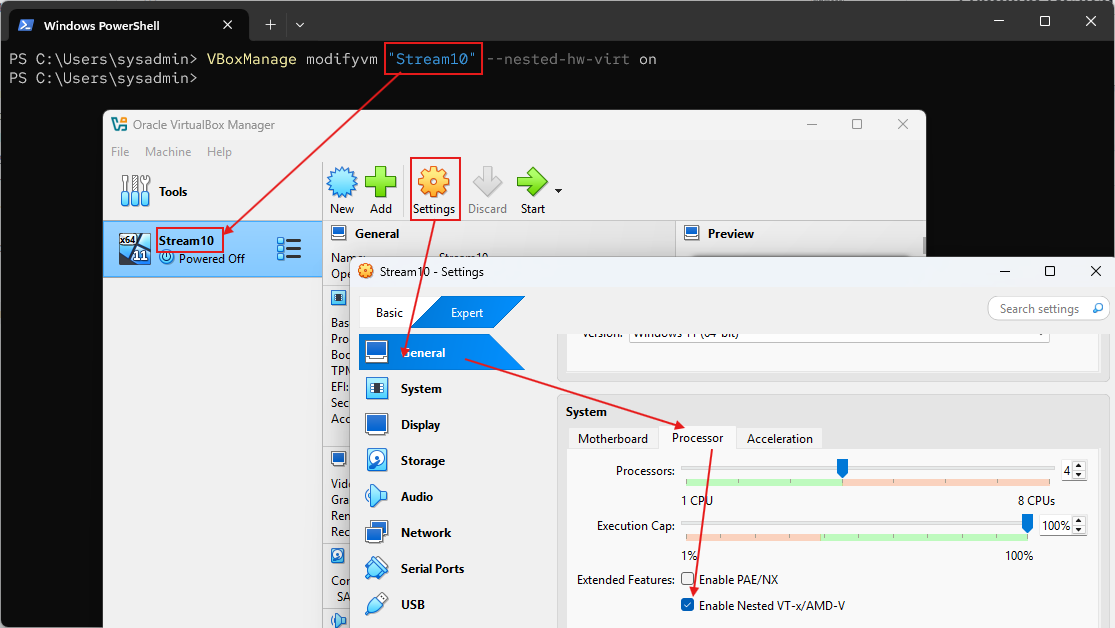 VBoxManage modifyvm "stream10" --nested-hw-virt on