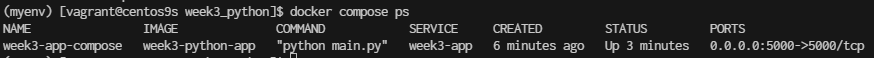 $ docker run -d -p 5000:5000 --name week3-app week3-python-app