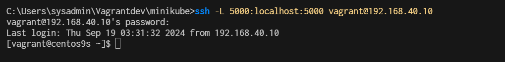 C:\Users\sysadmin\Vagrantdev\minikube>ssh -L 5000:localhost:5000 vagrant@192.168.40.10